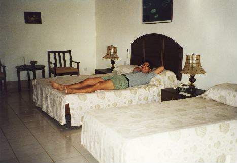 2階角部屋のファミリールームは、他の部屋よりちょっと大きめで3人分ベッドがあります。(ダブルとシングル)