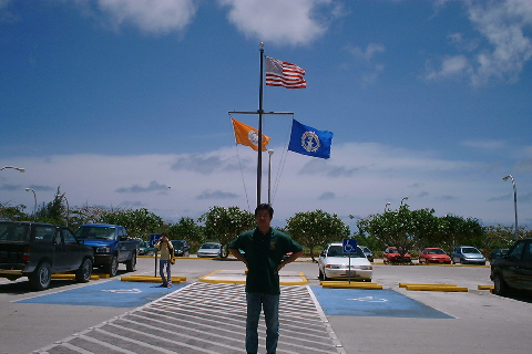 国連統治の旗とマリアナ諸島の旗がたなびく。